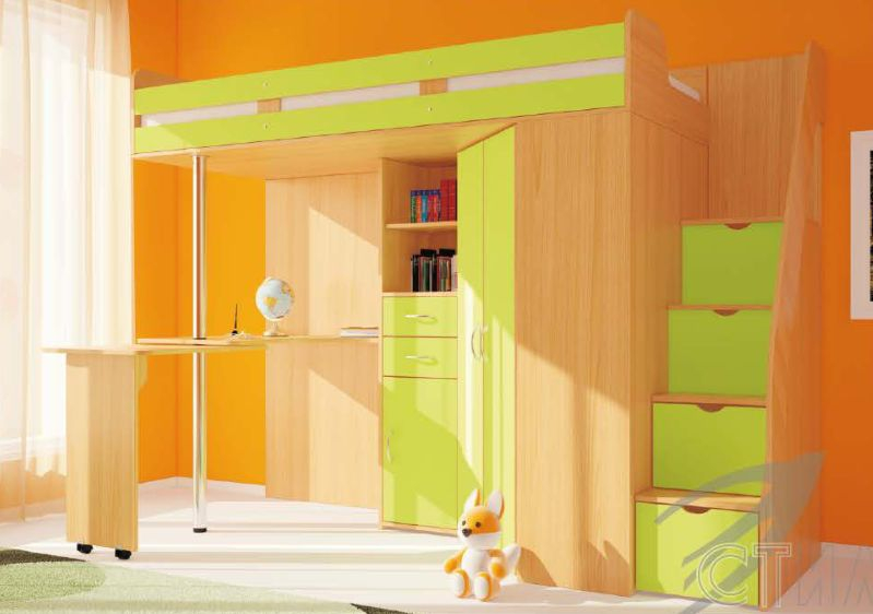Детская МИЙА - это кровать-чердак или даже детский комплекс, который соединил: полноценное спальное место, безопасные лесенки с функцией комода, вместительный угловой шкаф с полками и штангой, функциональный пенал с полками и ящиками и конечно же удобный, раздвижной рабочий стол.