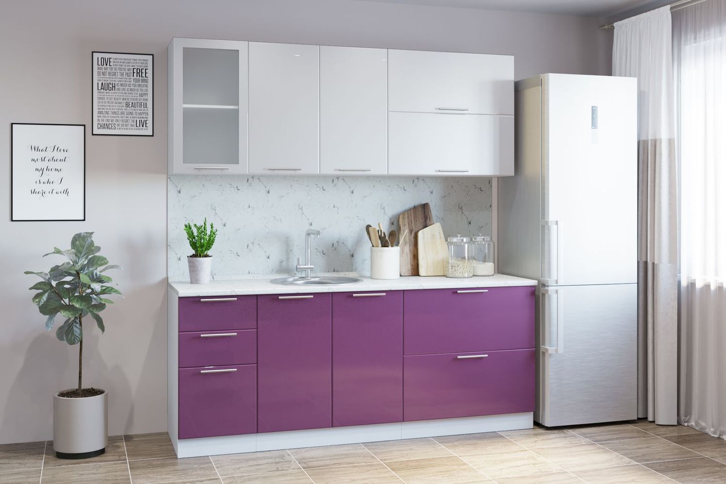 Гарнитур кухонный СОФТ В 2 (врезная мойка) металлик белый/фиолет.