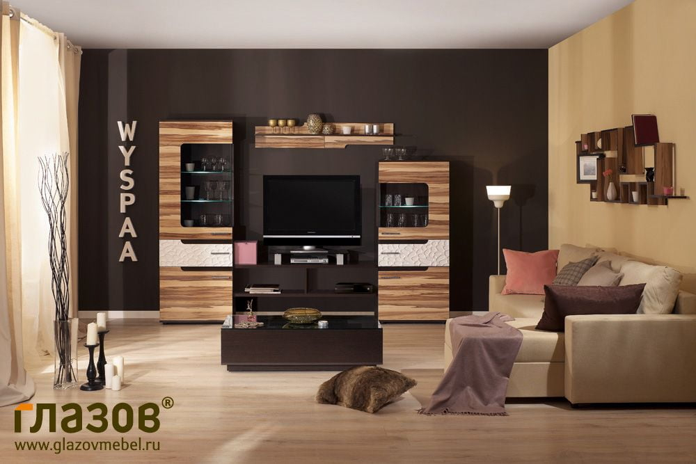 Легкая компоновка для гостиной из витрин WYSPAA 1 и 2 с модулем WYSPAA 9 Тумба Light – идеальный вариант для тех, кто ценит свободу пространства. За счëт облегченной конструкции места для ТВ компоновка выглядит воздушно.