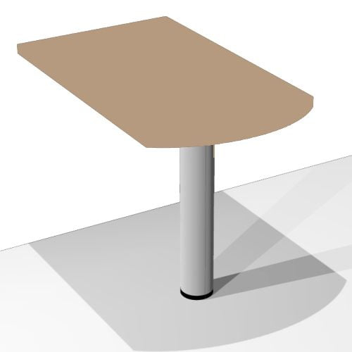 Приставка на опоре имеет столешницу прямоугольной формы с одной закругленной стороной. Это классическая конфигурация, используемая для увеличения площади столов. Металлическая опора надежно удерживает всю конструкцию. Такой мебельный предмет позволяет более практично и функционально использовать офисную мебель.