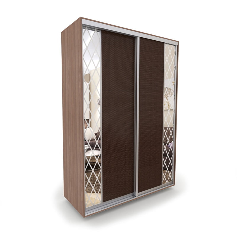 Двери купе выполнены в комбинации эко-кожи "Версаль" и зеркальной вставки с пескоструйной обработкой. Рисунок обработки "ромбы" фон зеркальный, рисунок - матовый. Для темных тонов ЛДСП корпуса используется темный цвет эко-кожи, для светлых тонов – светлая. Высококачественный толстостенный алюминиевый профиль цвета хром матовый.