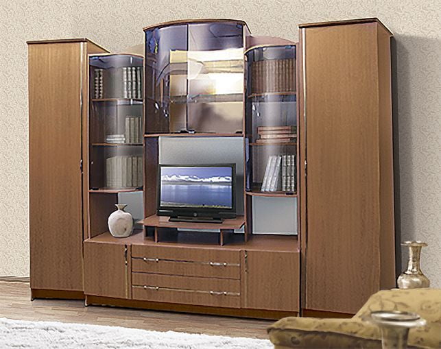 Стена для гостиной, с элементами из стекла. Плотяные шкафы по сторонам. Слевой стороны со штангой, справо с полками. Внизу 2 выдвижных ящика и 2 отделения без полок. Ниша под ТВ: ширина - 760 мм, высота - 795 мм.