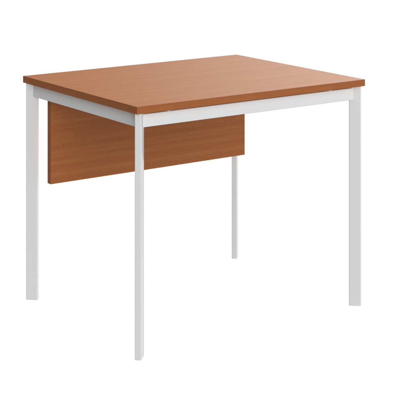 Столешница из ЛДСП т.22мм. Металлокаркас из трубы 40х20х1,5мм. без регулировки внизу. Опоры столов комплектуются пластиковой заглушкой. Покрытие краска белая полуматовая или алюминий. Металлокаркас соединяется со столешницей через металлическую проставку D-16мм. H-6мм. Комплектуется фронтальной панелью из ЛДСП т. 18мм. крепится к столешнице при помощи уголков.